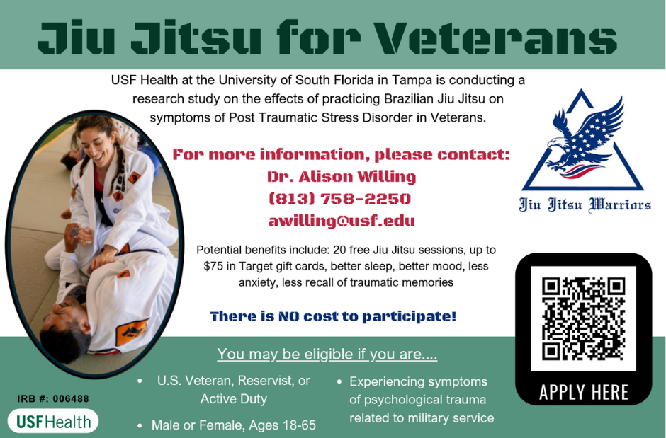 USF Health at the University of South Florida in Tampa is conducting a research study on the effects of practicing Brazilian Jiu Jitsu on symptoms of Post Traumatic Stress Disorder in Veterans.