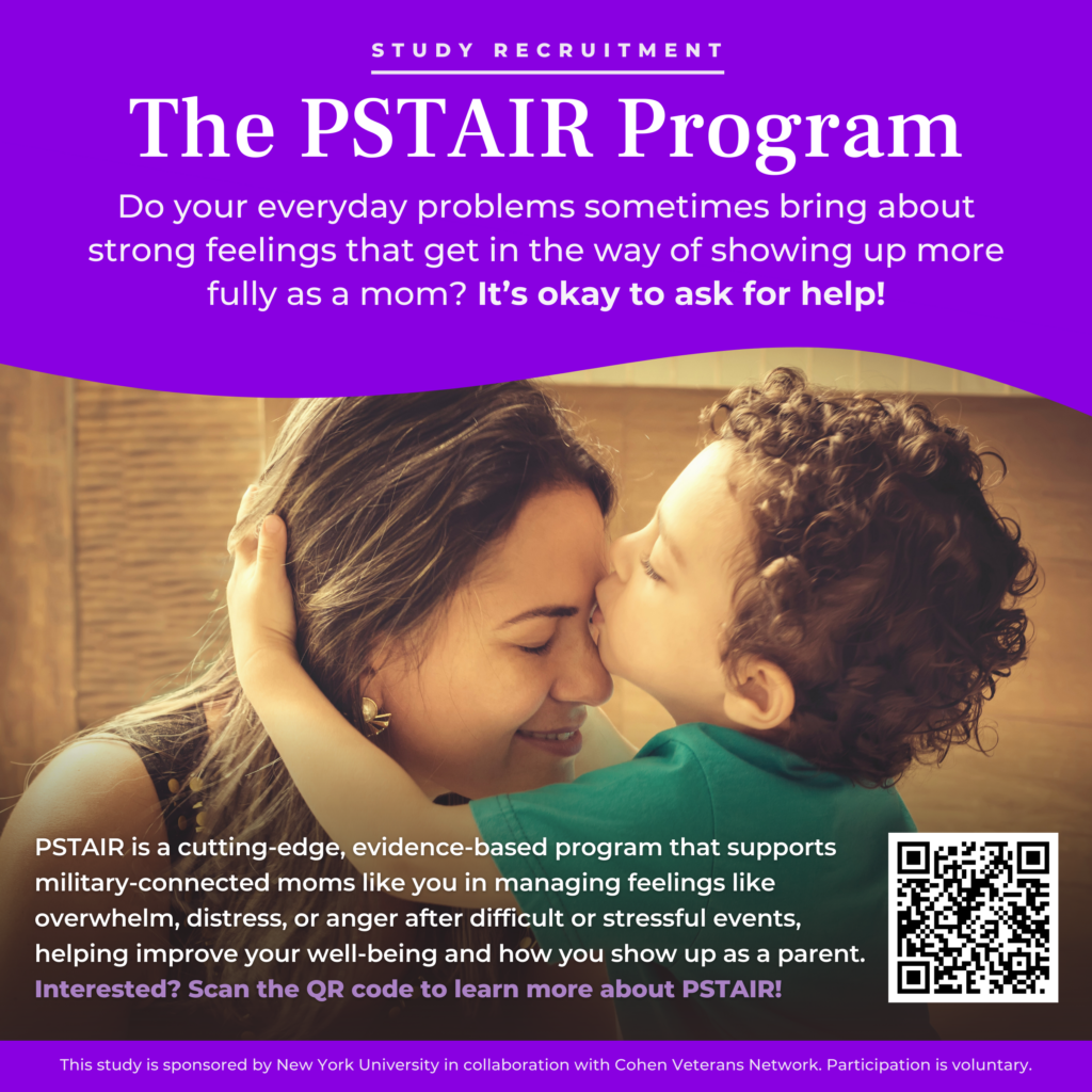 Conducted in partnership with the Steven A. Cohen Military Family Clinics at Endeavors in Texas, this study is evaluating PSTAIR, a cutting-edge, evidence-based program that supports military-connected moms in managing feelings like overwhelm, distress, or anger after difficult or stressful events, helping improve their well-being and how they show up as a parent. For more information, visit our website.
